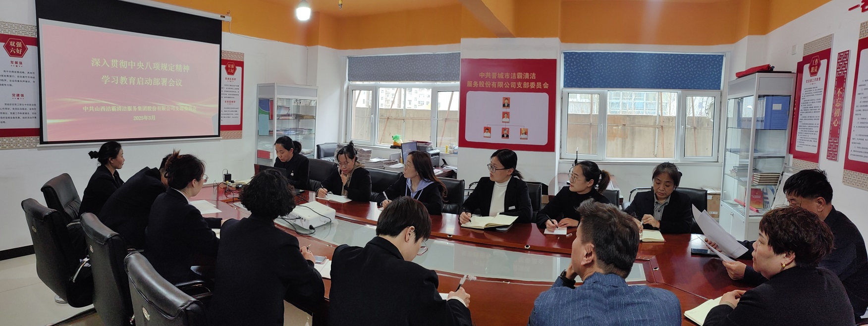 近日,山西潔霸清潔服務(wù)集團股份有限公司黨支部召開專題會議,對公司開展深入貫徹中央八項規(guī)定精神學(xué)習(xí)教育進行部署。支部書記程晉軍主持會議并講話。