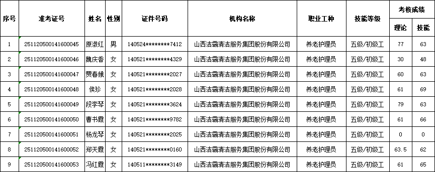 山西潔霸清潔服務(wù)集團(tuán)股份有限公司職業(yè)技能等級(jí)認(rèn)定中心現(xiàn)將2025年11月23日認(rèn)定人員成績公示如下: